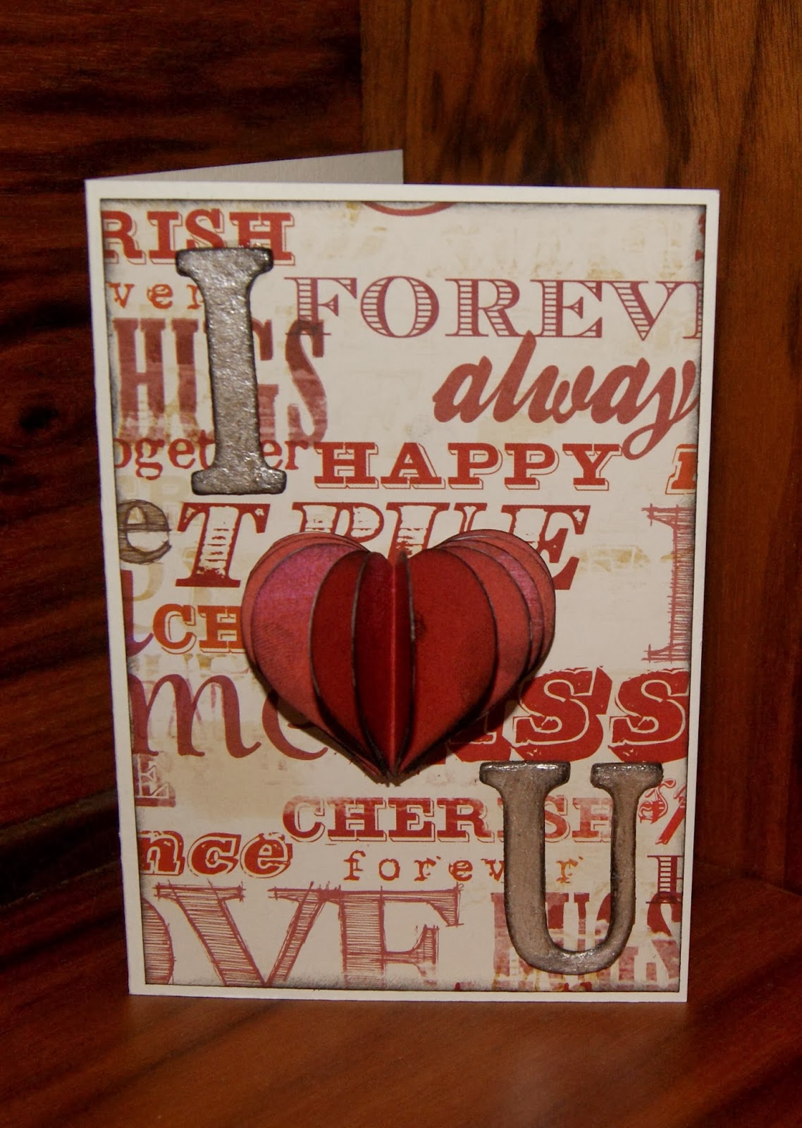 Ahora es el turno de Elena, que ha creado una tarjeta muy simple pero cuyo resultado es estupendo. La base es una cartulina blanca lisa que ha decorado con tonalidades rojas. En el centro, con un troquel de la Big Shot ha hecho un círculo festoneado. Con el mismo troquel y otros dos tamaños más grandes cortó el círculo festoneado rojo y añadió unos cuantos corazones. Para el título utilizó un alfabeto en stickers.