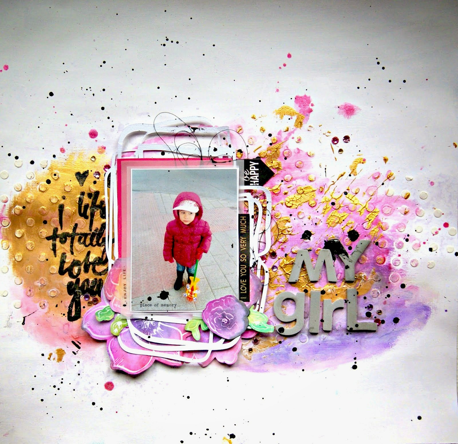 Quise hacer un Layout bien cuqui para mis gatitos, con mucho colorido y muy animado. Entonces se me ocurrió que podría crear una plantilla de este tipo con mi Silhouette Cameo, así que me puse manos a la obra, y éste fue el resultado que conseguí: