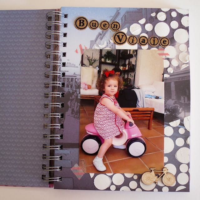 La primera página como veis, he tapado un poco el fondo con pasta de modelar y he utilizado el "ABC" adhesivo de corcho y la bici de madera. También he utilizado un poco de washi para fijar la foto. Deciros que el álbum tiene las paginas muy gruesas lo que permite utilizar pasta de modelar, tintas, gesso... ¡¡es ideal para guarrear!!
