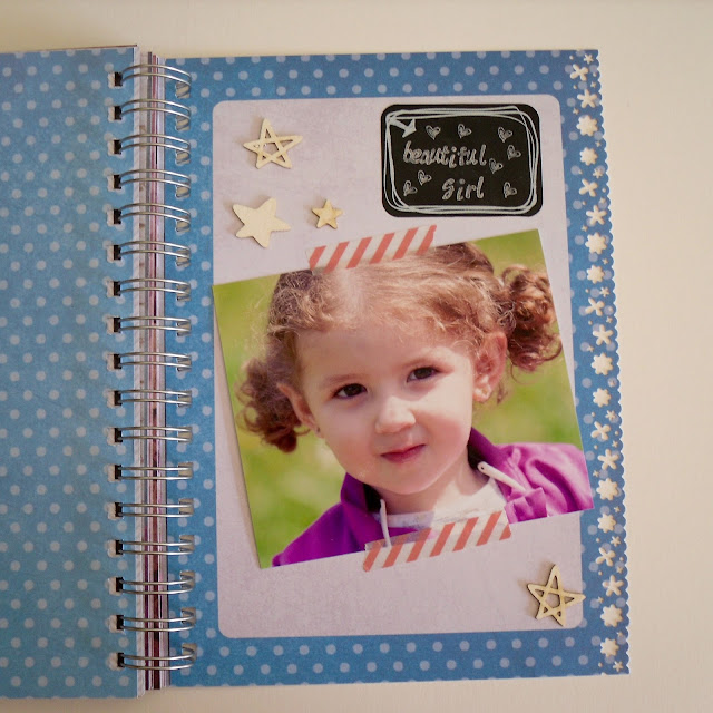 Y en la segunda página he utilizado un adhesivo de pizarra, en el que he estampado los sellos con tinta Versa Magic efecto tiza. He troquelado el borde y he fijado la foto con whasi. Y por supuesto mis estrellitas de madera para adornar.
