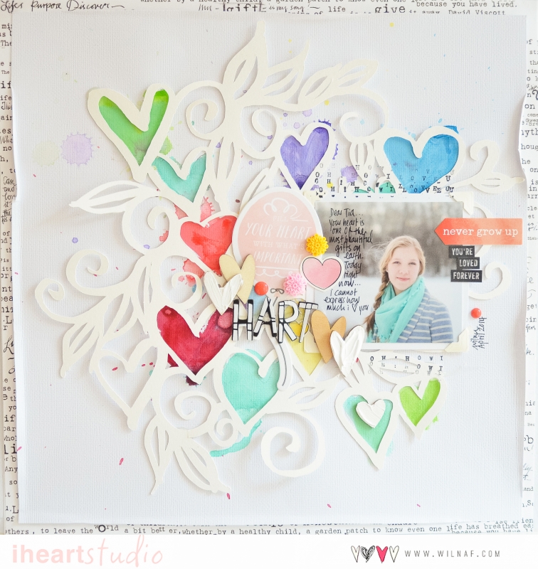 Ha realizado un Layout muy tierno en DIN A4 con el fondo blanco, en el que ha querido dar importancia a los colores, dadas las fechas que se acercan: HA seguido las pautas de Wilna incluyendo corazones tanto cortados con la Silhouette como de pegatinas; la llave es un die cut y ha utilizado pintura rosa para pintar el contorno del corazón.
