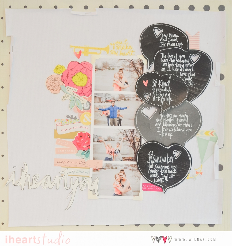 Para este reto Olga ha optado también por scrapliftear uno de los últimos trabajos de Wilna utilizando papeles, pegatinas y chipboard de la colección "Hello Love" de Crate Paper.